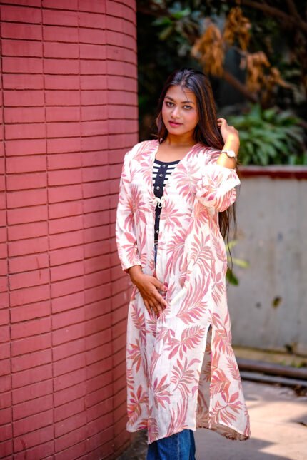 A romantic off‑shoulder blouse featuring bold pink floral prints on a white base with soft ruffle sleeves. Lightweight and easy to style with jeans or skirts for breezy summer days and casual outings.