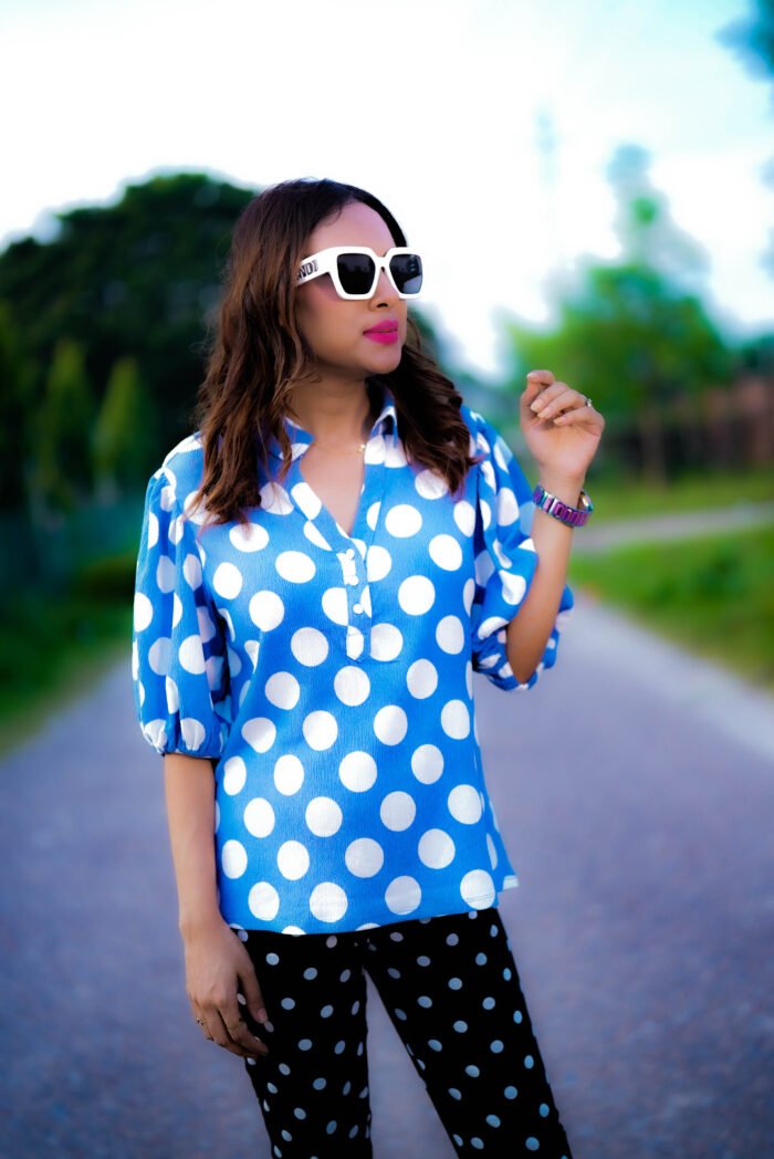 A playful blue blouse covered in crisp white polka dots, cut with a flattering V‑neck and easy short sleeves. Style with black or white bottoms for a timeless, retro‑inspired look that works from day to night