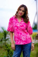Brighten any casual look with this hot‑pink floral top featuring statement puff sleeves and a relaxed silhouette. Pair with jeans or trousers for a fresh day‑out fit; breathable fabric keeps it comfortable and easy to style.