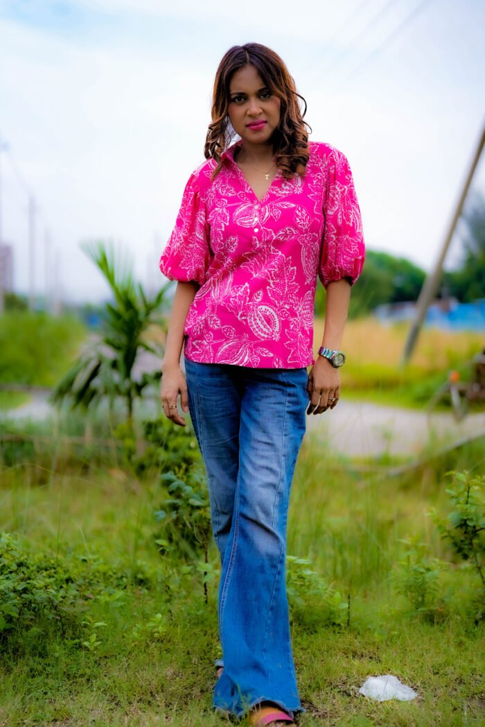 Brighten any casual look with this hot‑pink floral top featuring statement puff sleeves and a relaxed silhouette. Pair with jeans or trousers for a fresh day‑out fit; breathable fabric keeps it comfortable and easy to style.